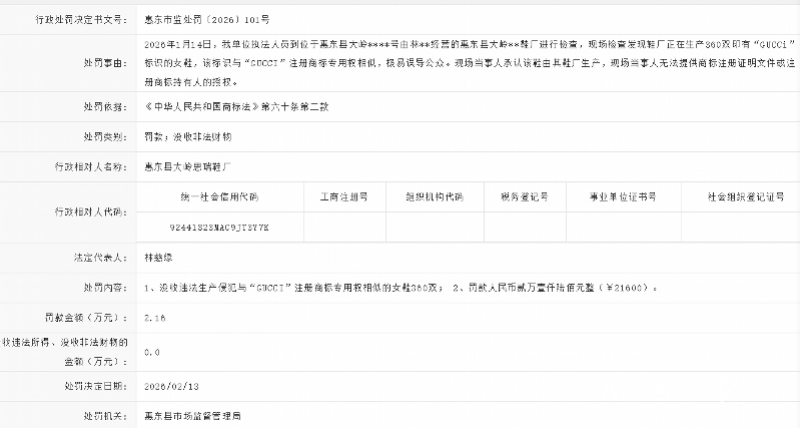 惠东市监处罚〔2026〕101号行政处罚决定书显示,依据《中华人民共和国商标法》第六十条第二款,监管部门作出没收违法生产的标注与“GUCCI”注册商标近似标识的女鞋360双、罚款21600元的处罚决定。